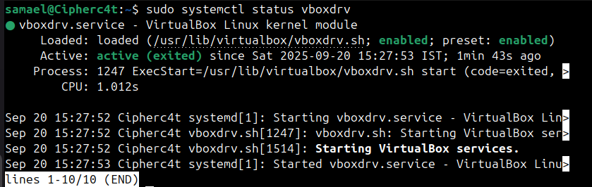 Verify this by running: sudo systemctl status vboxdrv