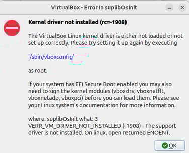On Linux, Secure Boot blocks unsigned VirtualBox DKMS modules (vboxdrv, vboxnetflt, vboxnetadp, vboxpci) from loading.