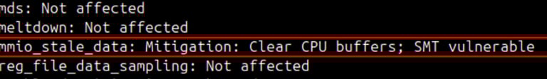While checking CPU vulnerabilities in Linux, if the result shows mmio_stale_data: Mitigation: Clear CPU buffers; SMT vulnerability, it indicates that your CPU has a hardware flaw known as MMIO Stale Data.