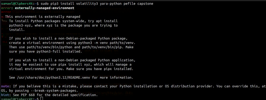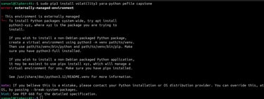 When installing malware analysis tools like Volatility or YARA on Linux, you may run into version conflicts or dependency errors. For example:
